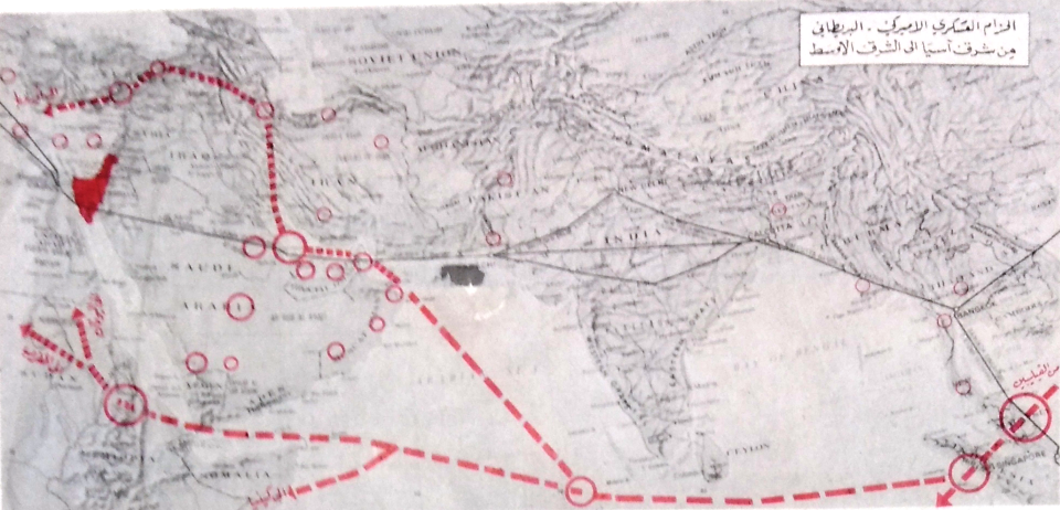 - وترتبط سلسلة القواعد هذه بسلسلة أخرى ذات أهمية خاصة من القواعد العسكرية البريطانية والأمريكية، تمتد من خليج عدن ومدخل البحر الأحمر، ثم على طول ساحل عُمان على المحيط الهندي، وصعودًا على شواطئ الخليج العربي حتى البحرين والظهران في السعودية.